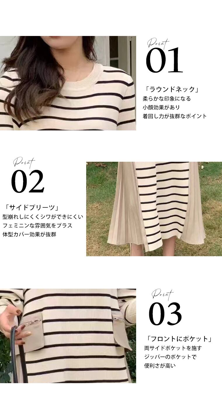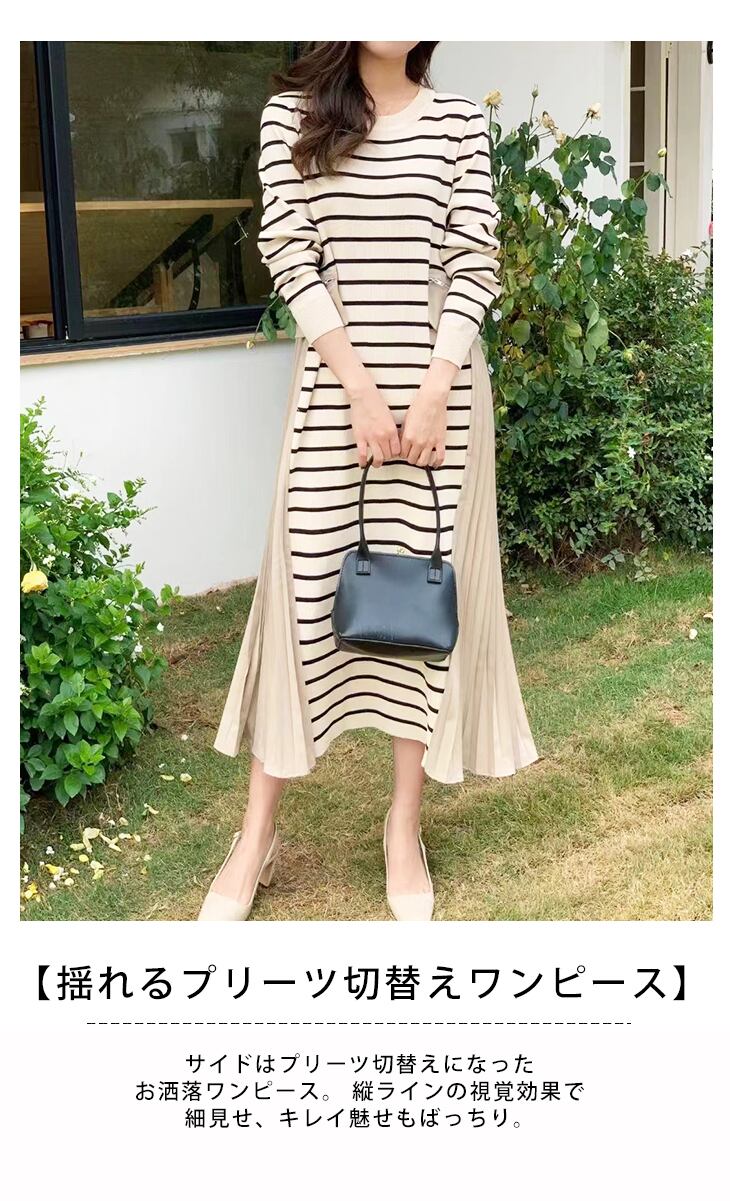 ムクユーmukuu レディース ワンピース サイドプリーツロングワンピース ワンピ サイドプリーツ プリーツ プリーツワンピース クルーネック 長袖 切替 ポケット 大人 着痩せ 体型カバー 着回し 華奢見せ 可愛い 細見せ お洒落 楽ちん ゆったり