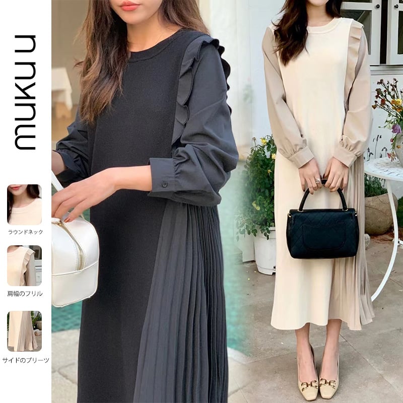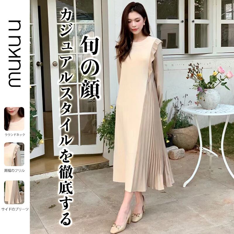 ムクユーmukuu レディース プリーツ ワンピース フリル タック ロング きれい ナチュラル系 サラサラ かわいいワンピース オシャレ フェミニン シャツワンピ 心地いい ロングワンピース アシンメトリ 切り替え 柔らかい 可愛い