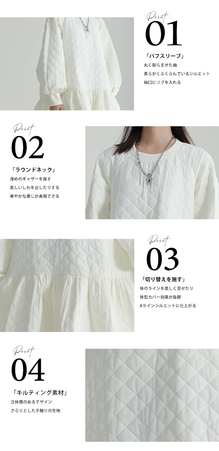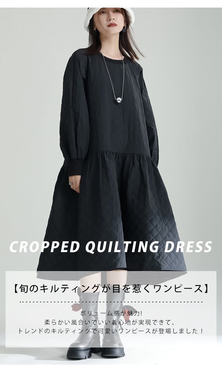 ムクユーmukuu キルティング ワンピース レディース 長袖 ひざ丈 膝下 ひざ下 ミディワンピース ワンピース フレア aライン あったかい ゆったり 体型カバー 着痩せ ラウンドネック リブ リラクシー カジュアル パフスリーブ ふんわり