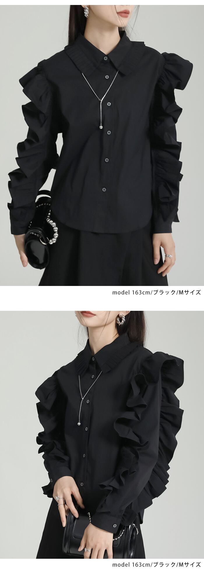 ムクユーmukuu レディース シャツ ブラック ホワイト ラッフルフリルスリーブ 長袖 シャツ トップス きちんと トレンド ボリューム リラクシー フォーマル シーン 柔らかい カジュアル 可愛い タック ワイドカラー 長袖