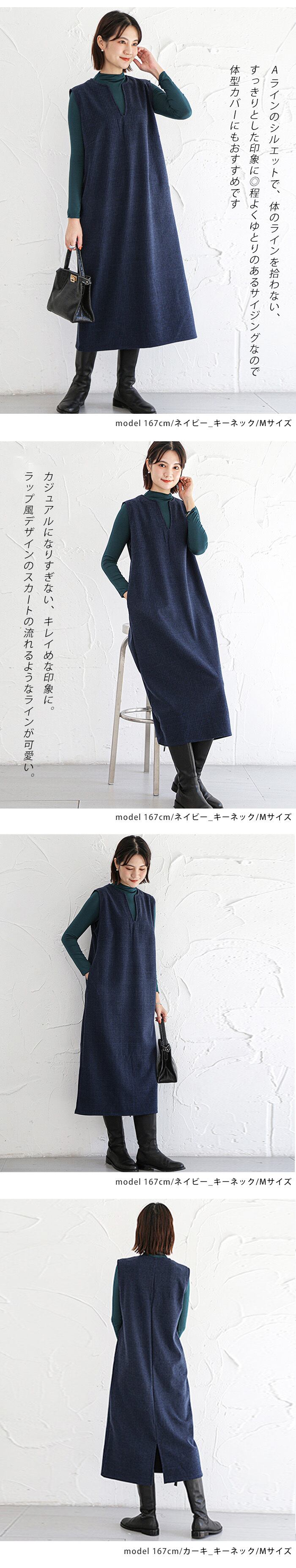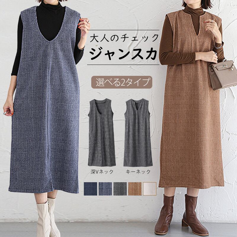 ムクユーmukuu前後2way チェック柄 サイドスリット レディース きれいめ Vネックチェックワンピース 選べる2タイプ チェック ジャンパースカート ワンピース 秋 冬 ロングワンピース ワンピース マキシ丈 可愛い スリット 体型カバー