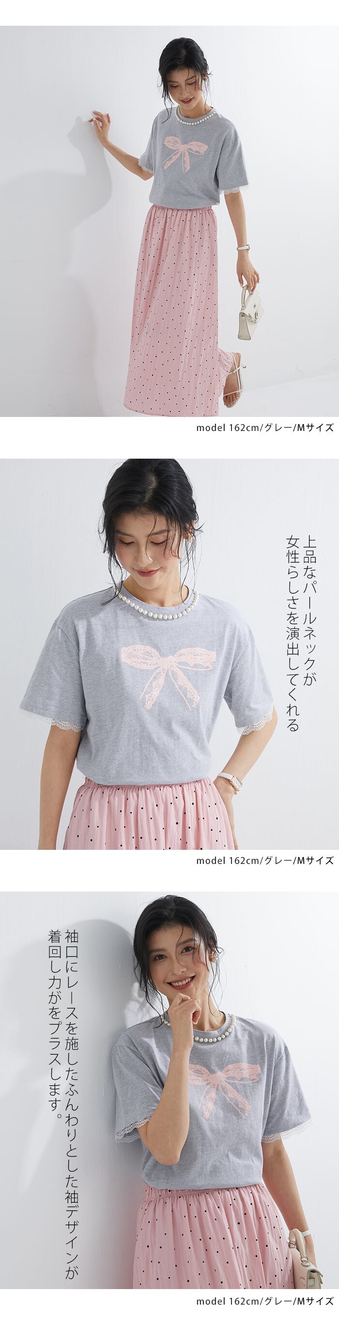 トップス レディース 綺麗 かわいい いい着心地長袖 ナチュラル ボリューム すっきり 体型カバー シンプルコーデ 着瘦せ パールネック リボンプリント 柄 レース 柔らかい素材 上品 リラクシー かわいい