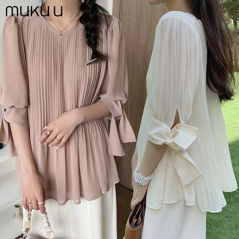ムクユーmukuu レディース シフォンフリル トップス お肌触り 可愛い ボリューム キーネックブラウス シーン 柔らかい 体型カバー ハンサム すっきり モード 夏物 可愛い リラクシー カジュアル 可愛い 爽やか いい着心地