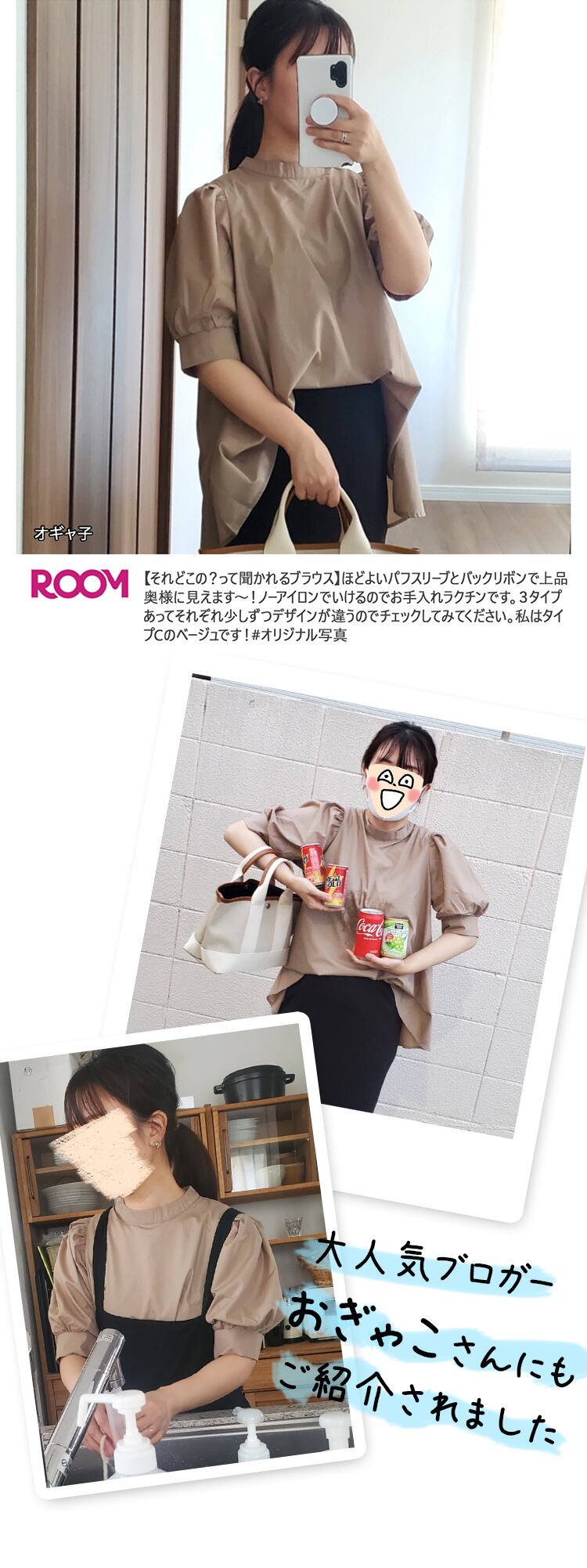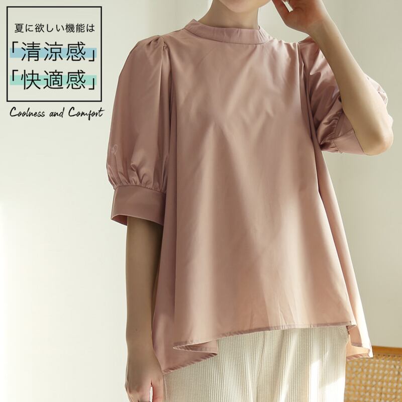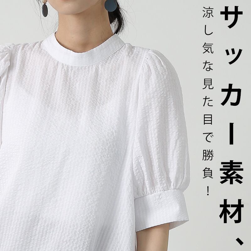 ムクユーmukuu やや構築的なパワーショルダー。サッカー素材 ボリューム袖バックリボントップス」 パフスリーブ 五分袖ブラウス 綿混サッカー素材 表面の凹凸は、 清涼感があり春夏にピッタリの素材。