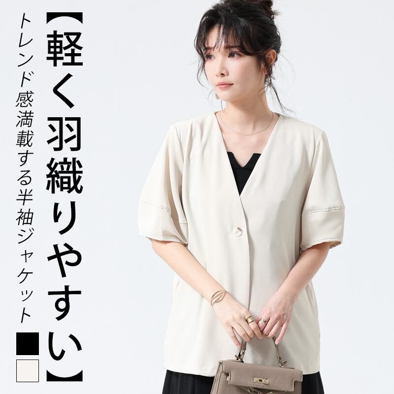 ムクユーmukuu レディース ジャケット Vネックノーカラー 半袖 カジュアルスタイル柔らかい印象 いい着心地 肌触り きちんと感 トレンド感 可愛い程よい抜け感 リラックスシルエット 体型カバー ボリューム