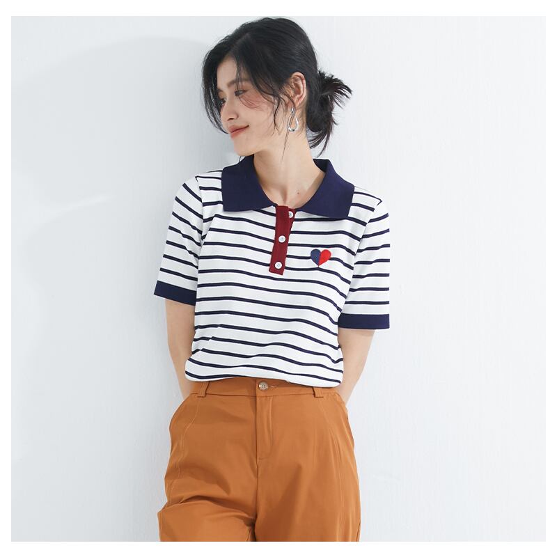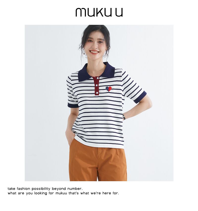 ムクユーmukuu レディース 襟付き バイカラー スポーツ ボーダー柄 ハーフボタン 半袖 Tシャツ オフィスディリートップスきれいめ甘くかわいい カジュアルスタイルオフィスリラクシー 抜け感 いい着心地柔らかい印象 オシャレきれいかわいい