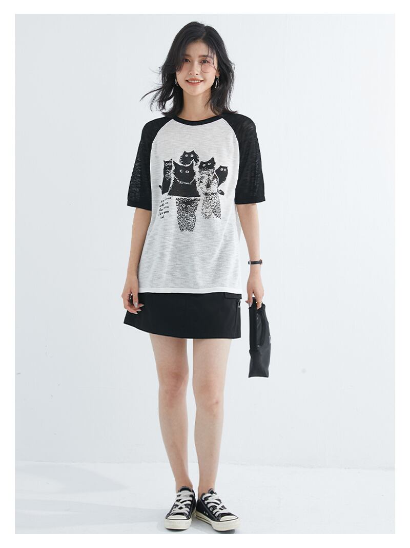ムクユーmukuu レディーストップス フレンチスリーブ 猫の柄 カジュアルスタイルオフィス半袖 リラクシー きれいめ甘くかわいい抜け感 いい着心地柔らかい印象 オシャレきれいかわいい ラウンドネック体型カバー オフィスディリー