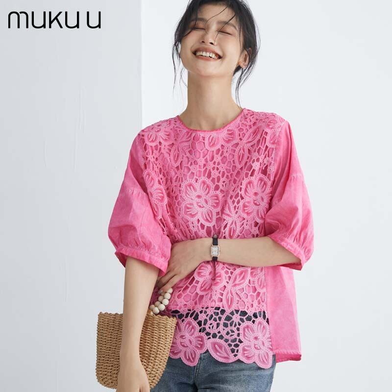 ムクユーmukuu レディーストップス ブラウス 柔らかい素材 いい着心地 日焼け止め 夏物 リラクシー 上品 薄手 かわいい 綺麗 半袖 ラウンドネック パフスリーブ