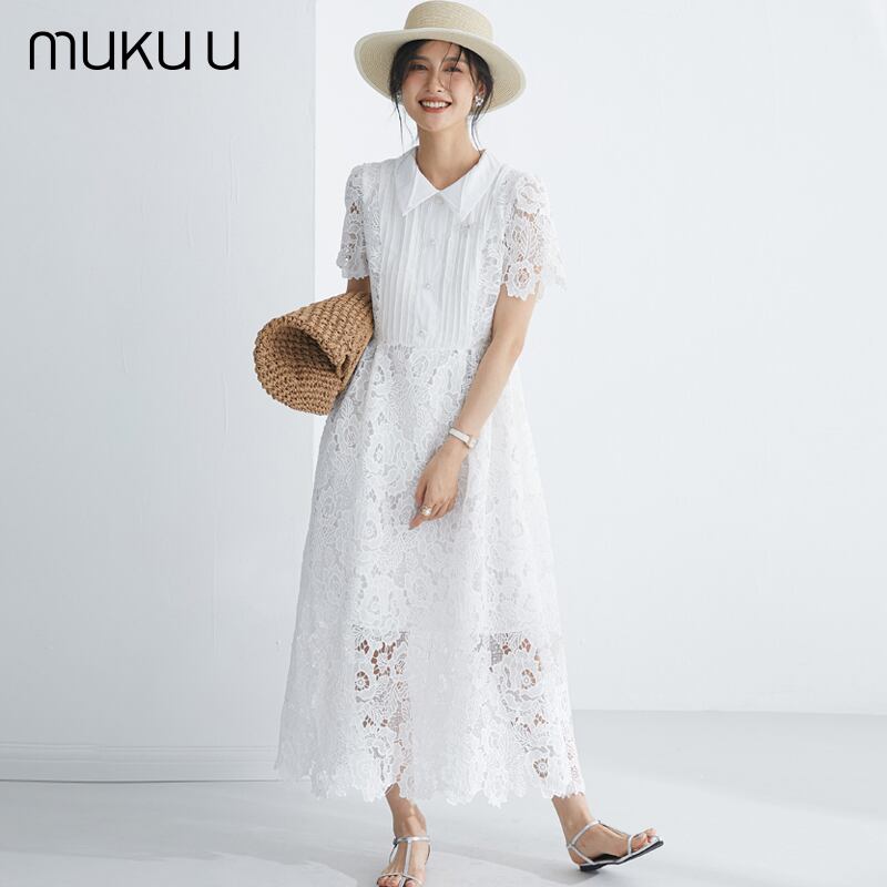 ムクユーmukuu レディース パール 花柄レース 襟付き ワンピース 半袖 ラウンドネック リラクシー いい着心地 柔らかい 夏物
